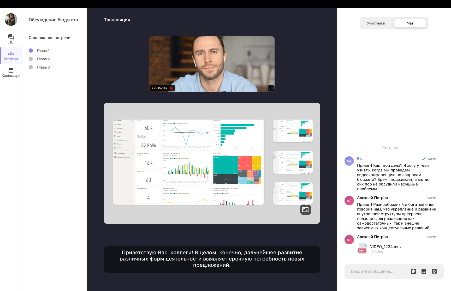 Широкая функциональность. Демонстрация презентации, экрана, интерактивная доска, смена ведущего и управление правами пользователей, встроенный чат, запись конференции.